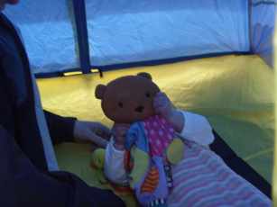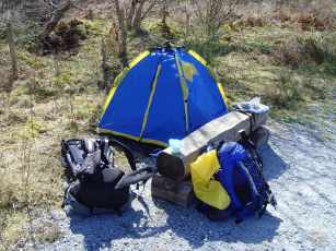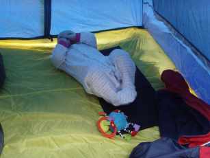 For stops you will really need a small tent, as you may be there some time, and nappy changes are best done somewhere warm and out of the wind. We used a Shelta pop-up beach tent that could be strapped to the side of a rucksack together with a small groundsheet. This kept the wind off, provided good ventilation on sunny days, and only took a minute or so to put up and to pack. The downside of a beach tent is that they are not designed for more than light drizzle.